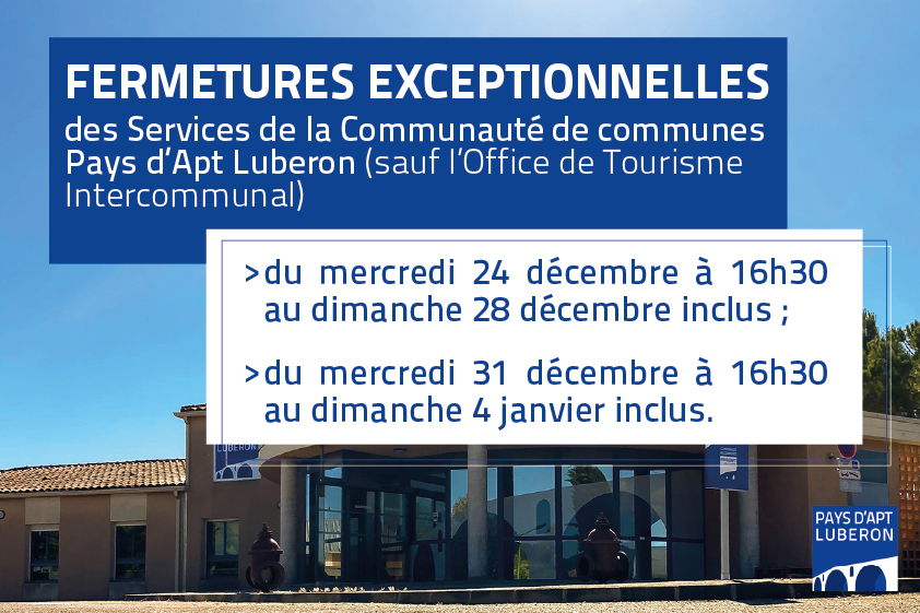 Les Services de la Communauté de communes (sauf l’Office de Tourisme Pays d’Apt Luberon) seront exceptionnellement fermés :